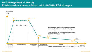 C3 Dichtheitsprüfung mit Luft oder inertem Gas für Gasversorgungsleitungen mit einem DP von 5 – 16 bar. Das Verfahren kann mit oder ohne Messung der Erdtemperatur angewendet werden. Prüfaufsicht: Sachverständiger, dieser legt die Höhe des Prüfdruckes [STP] und das Messverfahren mit oder ohne Messung der Erdtemperatur fest.